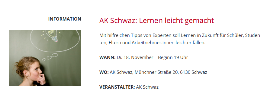 Infoabend der AK Tirol - Schwaz zum Thema "Lernen leicht gemacht".